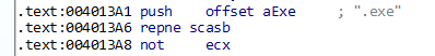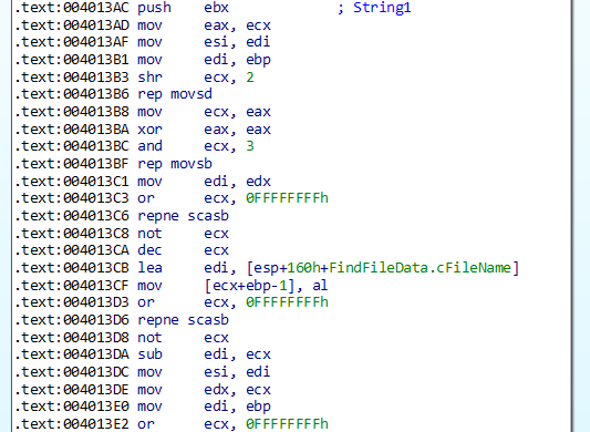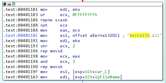 We see a reference to “kerne132.dll” at loc_40118C. We don’t see any function calls or other ASCII strings, but we see “repne scasb” and “rep movsb”. These instruction do the following: