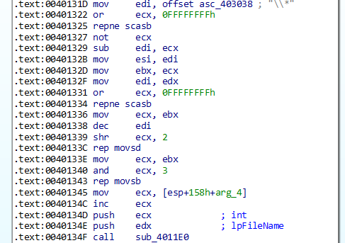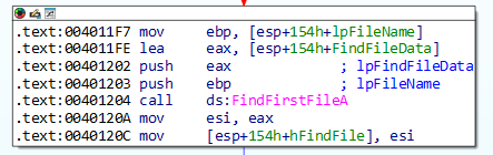 We should remember that the other argument to this subroutine was the file path within which the file search will be carried out. It’s hard to tell what the value of EDX is at the point it’s pushed onto the stack (loc_40134E), but we can venture a guess that it’s going to have something to do with “\*” that we saw at loc_40131D. We can’t simply search within “\”, and it wouldn’t make sense for this subroutine to first run with “C:\*” and then run with just “\” seven times. Then how does “\” come into the file path argument?