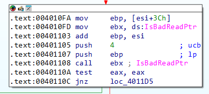 Later on, we see a call to “IsBadReadPtr”. This function verifies that the program has access to the part of memory that the pointer is referencing. As the malware is working with a file loaded in memory, and “MapViewOfFile” returns a pointer to the memory location where the file has been loaded, this might just be to check that the .exe file has been loaded successfully. Perhaps some .exe files found by the malware cannot be loaded by it into memory, so this is likely just used for error handling:
