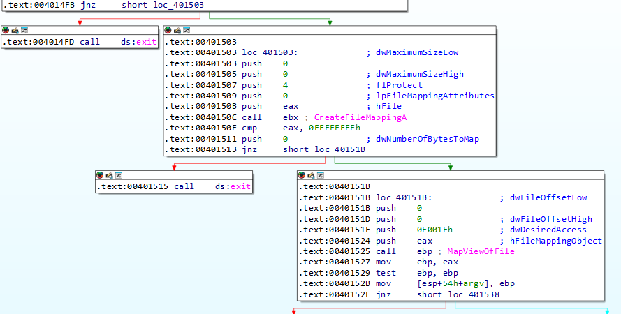 The second call is to “CreateFileMappingA” which acts on the “kernel32.dll” file handle that we opened with "CreateFileA” (you can see the handle being passed as an argument to “CreateFileMappingA” when EAX, which at this point still stores the return value of the "CreateFileA” function, is pushed onto the stack at loc_4014BE). The function “CreateFileMappingA” will create a file mapping of “kernel32.dll”. The file mapping will make the code of “kernel32.dll” accessible to our malware later on.