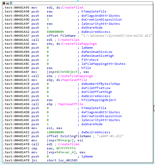 Based on this and based on what we see in other parts of this malware, we can assume that this part of the code manipulates the mappings of these two files. I have a feeling that the operating system would not allow us to change the important “kernel32.dll” file, however it should not have a problem with us changing our own “Lab07-03.dll”. Therefore, this leads me to assume that these file manipulations are related to manipulating “Lab07-03.dll” based on “kernel32.dll”, rather than the other way round. As “Lab07-03.dll” already contains some functionality, we can make a guess that it might have some more functionality added to it from “kernel32.dll”.