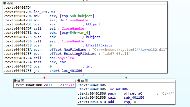 Continuing on, we see the malware considerately closing the two handles to file mappings of “Lab07-03.dll” and “kernel32.dll”. This frees up some memory since those handles won’t be used anymore, but based on my quick google search, is not actually required. Noting this polite gesture, we can move on to the next function call that is “CopyFileA”. This function will copy an existing file to a new file. We can see that the existing file is our “Lab07-03.dll”, and the new file will be located inside “System32” and named “kerne132.dll”.