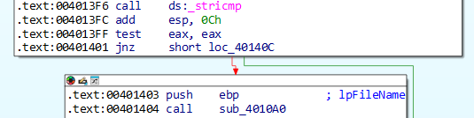 Therefore if, at the beginning of the program, the found file is a directory, then the execution will continue to the second big block and the subroutine will be called again with that directory being the file path argument. If the found file is an individual file, then the file extension will be compared against “.exe”, and if a match is found, the file name will be provided to a new subroutine sub_4010A0.