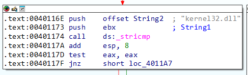 We see a call to “stricmp”, which will compare two strings and return 0 if they are equal. Based on the push instructions prior to the call, an unknown string stored in EBX will be compared to “kernel32.dll”.