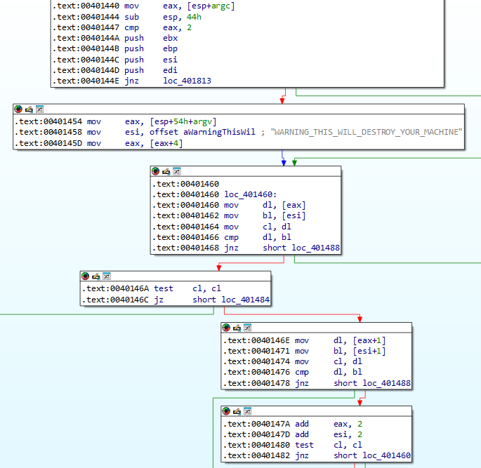 ESI points to the warning string “WARNING_THIS_WILL_DESTROY_YOUR_MACHINE”, as we can see in loc_401458.