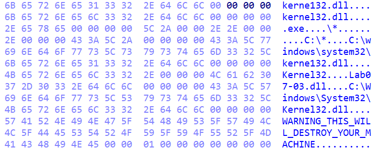 At this point we can guess that the malware is creating a file impersonating “kernel32.dll”, and that the previous operations on the file mapping of “kernel32.dll” were likely meant to copy its functionality over to “Lab07-03.dll” and then to “kerne132.dll” (I will keep the file name in italics to differentiate it from the original “kernel32.dll”). I’m unsure why the malware didn’t just copy it directly into “kerne132.dll”. Perhaps it’s due to “kerne132.dll” being in the System32 directory which might not allow file manipulation, but might allow file creation in some cases - I’m unsure. Either way, at this point we have a new file impersonating the original “kernel32.dll”.